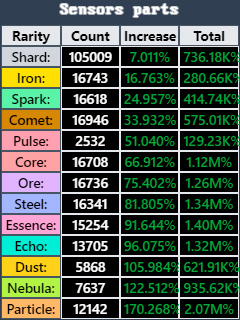 When you equip a Sensor Part Item it increases the equipped items Count and adds 5% to the Increase multiplier (other than the Shard tier, it has a smaller added multiplier).